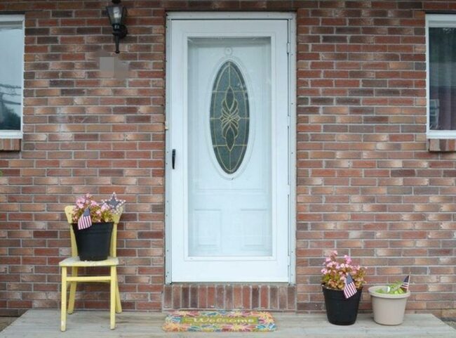 Nearby, a bright doormat provides a friendly greeting right at the doorstep.
