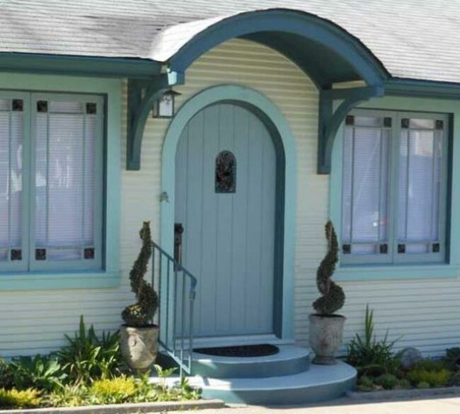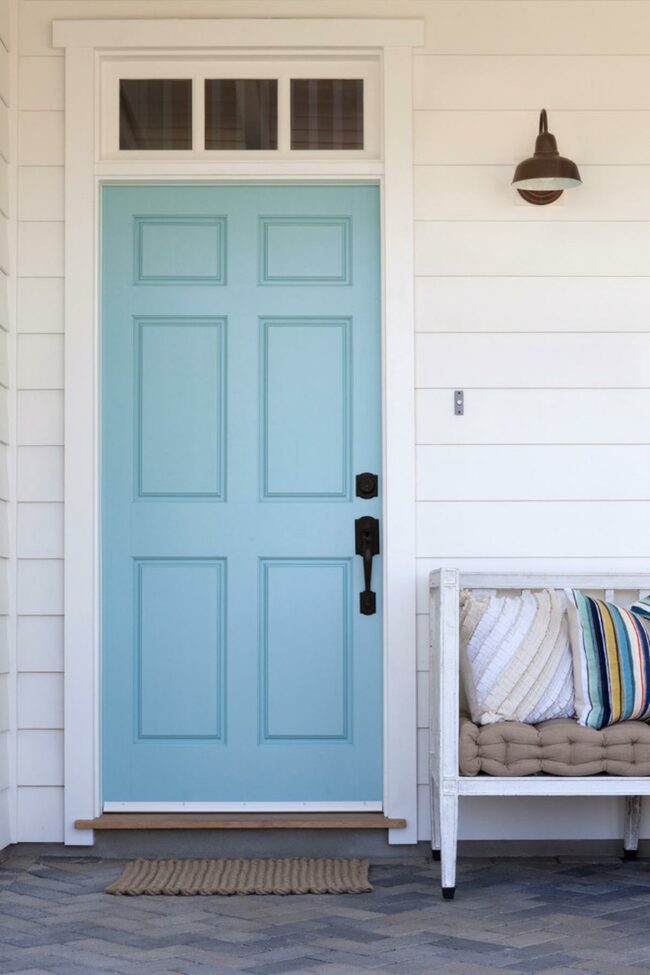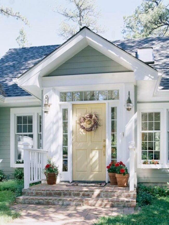 White trim frames the entrance with clean, crisp lines that highlight the architectural details.
