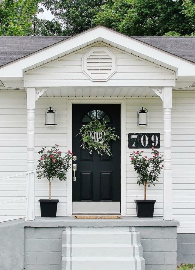 Dark black paint dramatically highlights the light gray siding surrounding the entrance, creating instant visual drama.