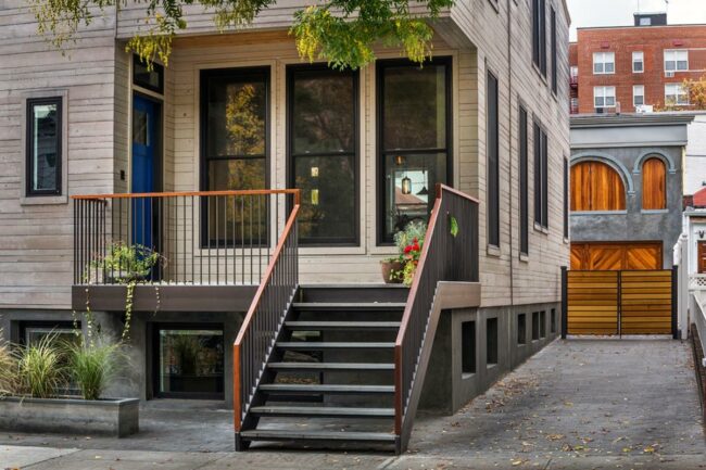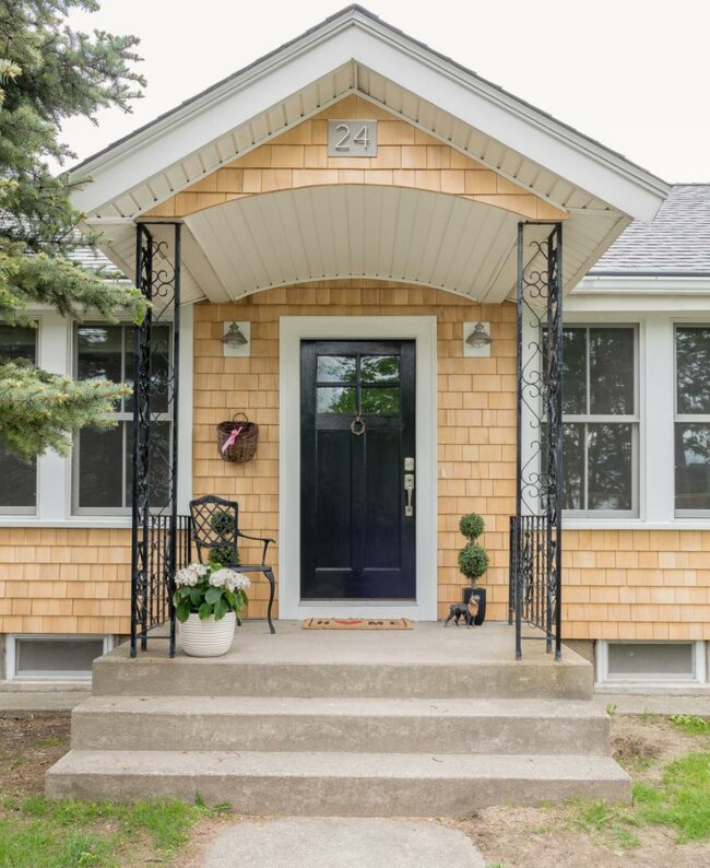 Dark stairs lead up to the welcoming entrance, complemented by simple metal railings.