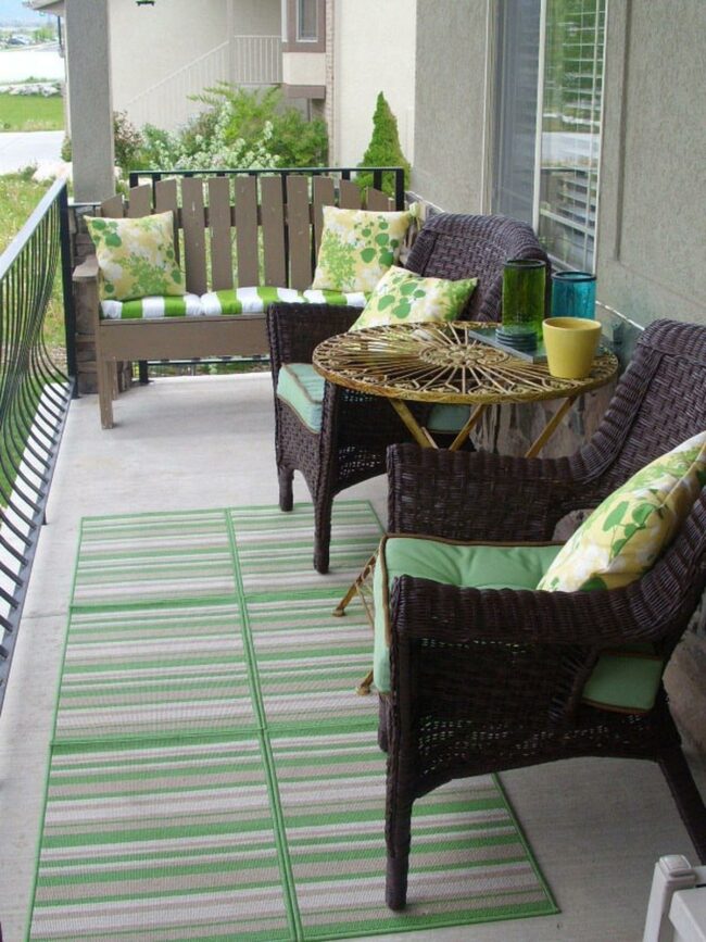 A green-striped rug adds color to the gray floor, creating visual interest beneath the seating.