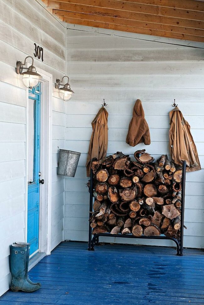 Nearby metal baskets filled with birch logs suggest cozy fireside moments just steps away.