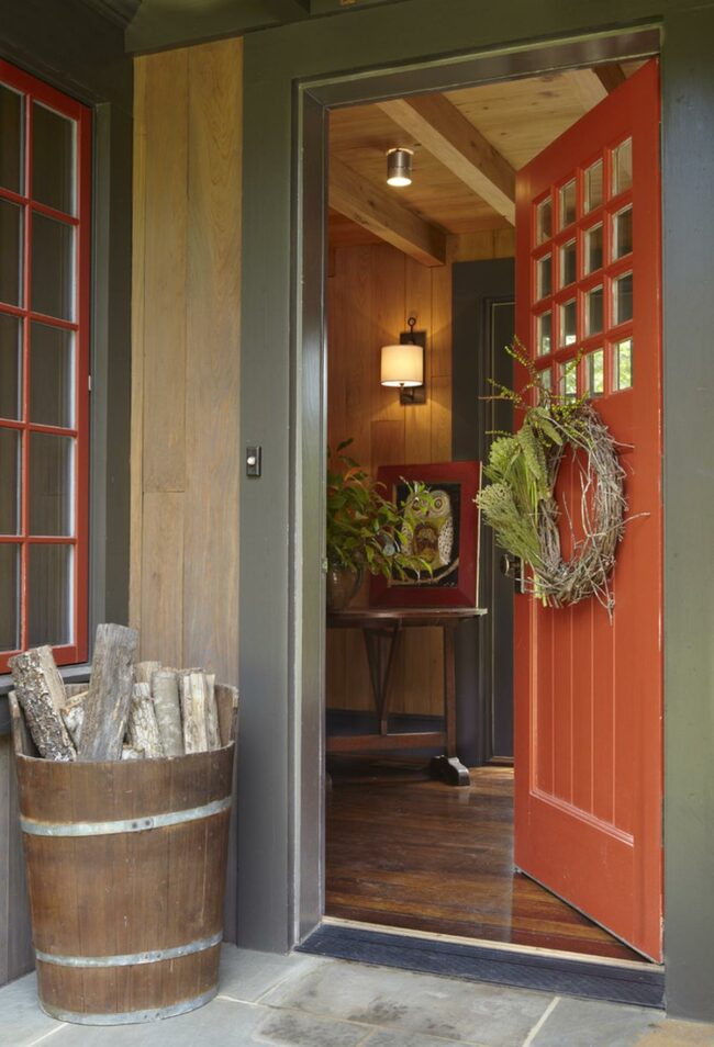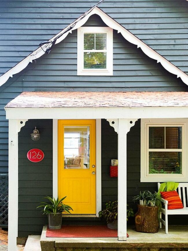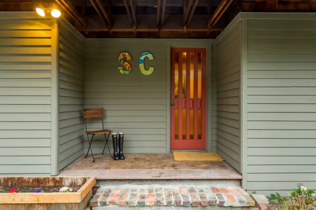 Gray siding frames the exterior, making a bold red door pop with personality.