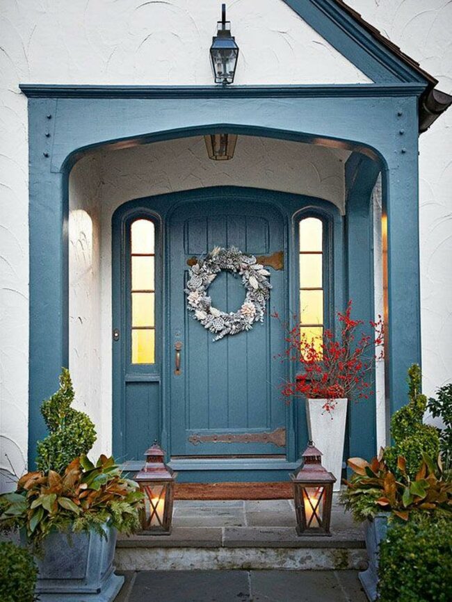This particular porch showcases a charming blue door flanked by tall, narrow windows that draw your eye instantly.