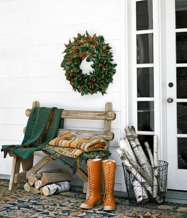 Twigs and greenery form a simple wreath on the door, welcoming visitors with understated grace.