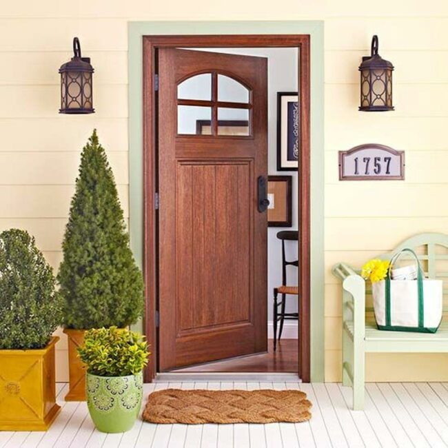 Wooden entryways glow with warm brown tones and delicate glass panes that invite natural light inside.