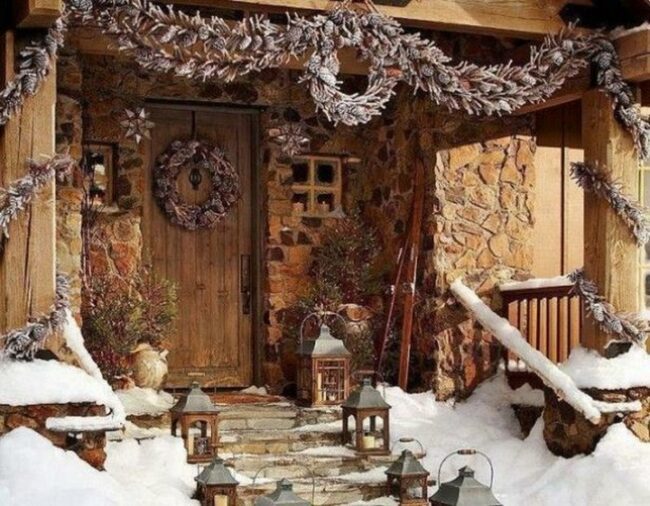 Hanging in the center, a festive white pine cone and leaf wreath adds a seasonal touch to the entrance.