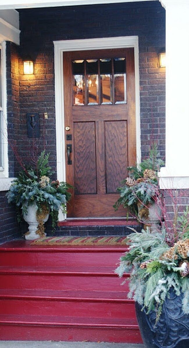 Green plants scattered on the steps add a fresh, natural touch to the entrance.