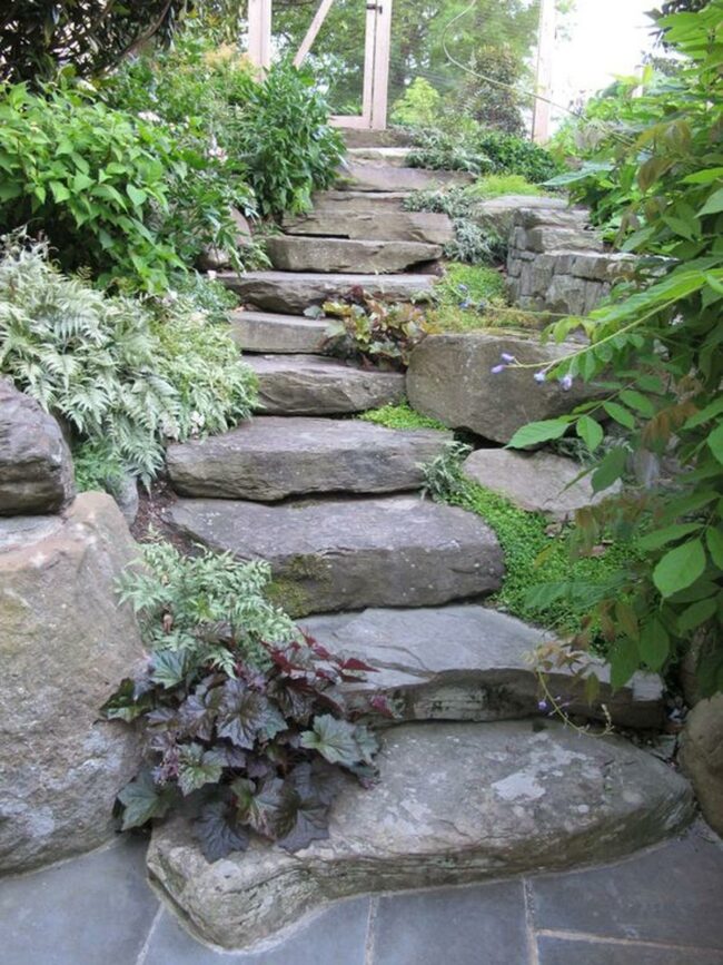 Stone steps wind through lush greenery, creating an inviting walkway.