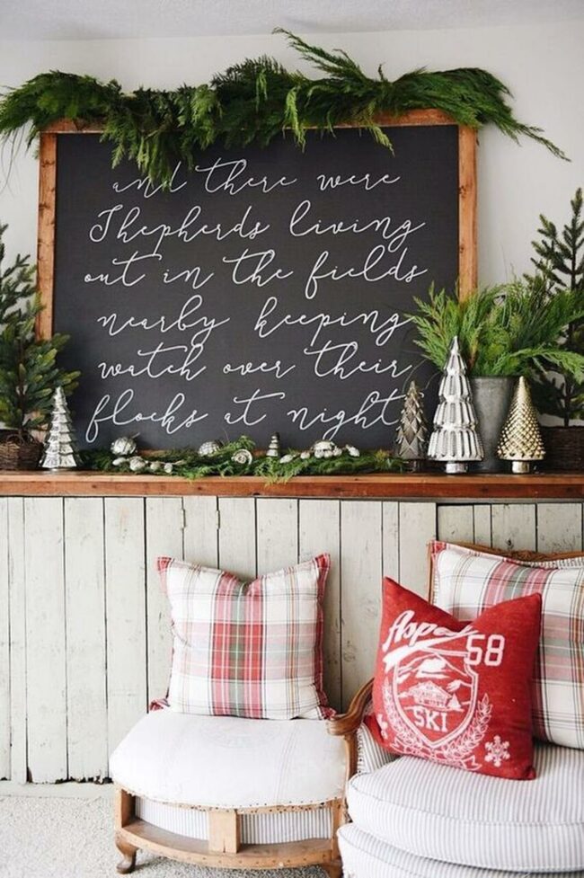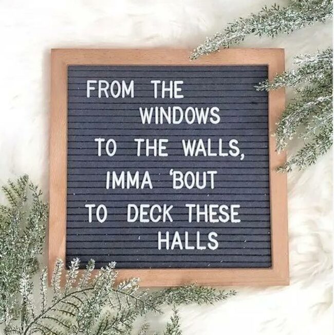 Black-lettered signs add personality and holiday spirit to the room's aesthetic.
