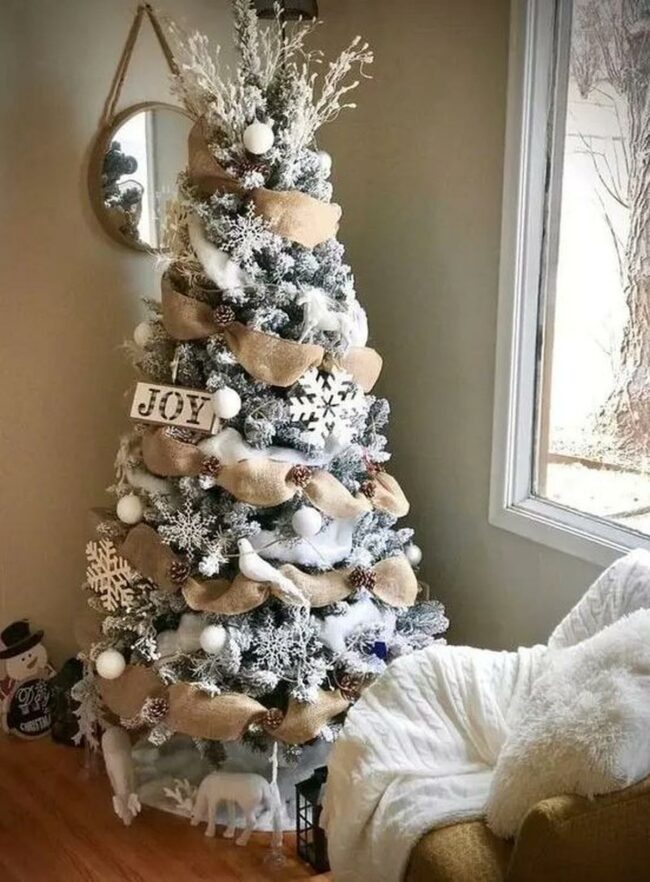 Two small snowy Christmas trees nestle in the corner, bringing winter magic to the space.