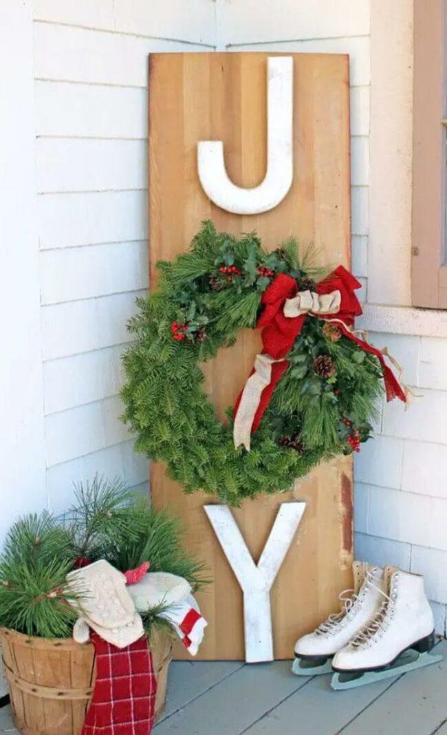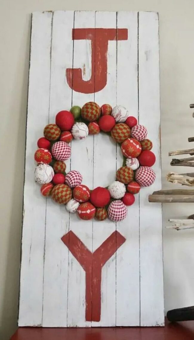 Red "JOY" letters boldly announce the seasonal spirit across a weathered wooden board.