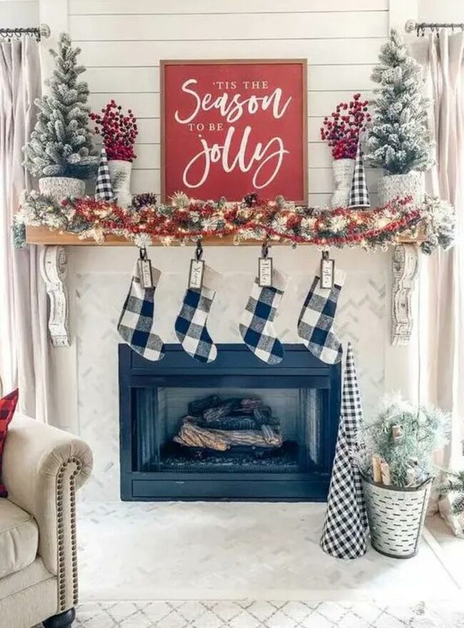Black-and-white plaid stockings hang neatly on the wall, anchoring the room's holiday spirit.