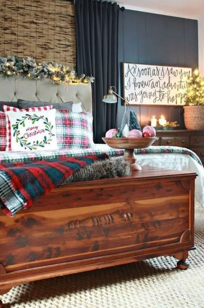 Soft lighting completes this inviting holiday retreat, making the bedroom feel like a heartwarming Christmas embrace.