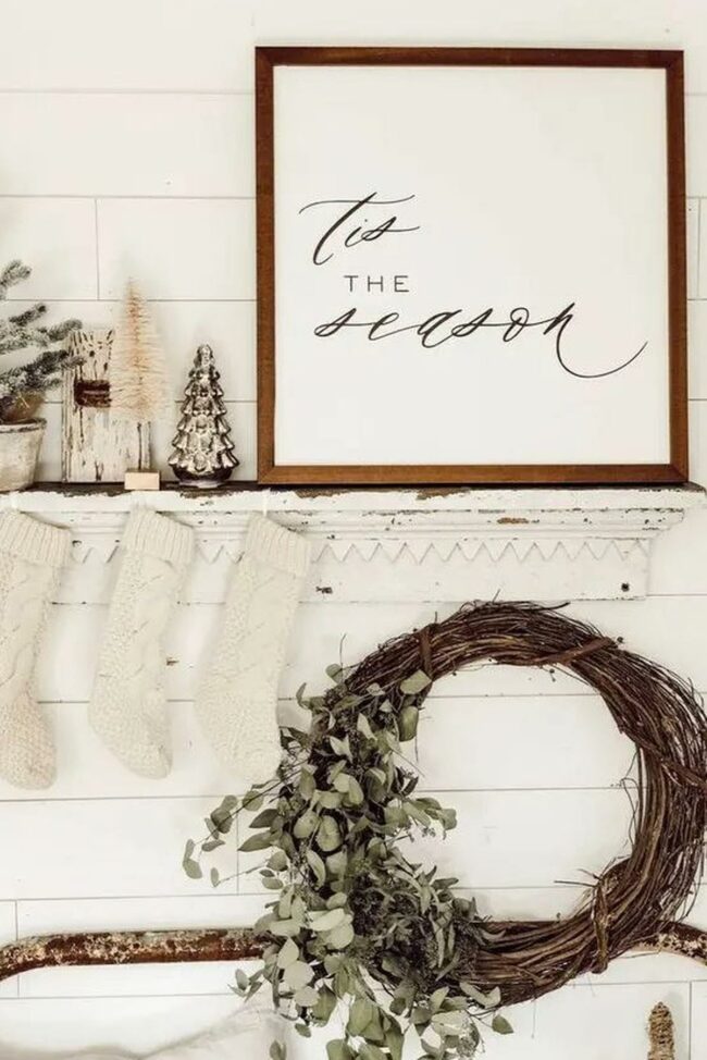 Rustic wooden signs with seasonal greetings hang surrounded by delicate greenery, adding character to the neutral walls.