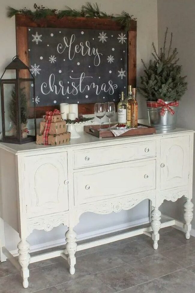 Small cabinets display additional holiday accents that enhance the cozy winter atmosphere.