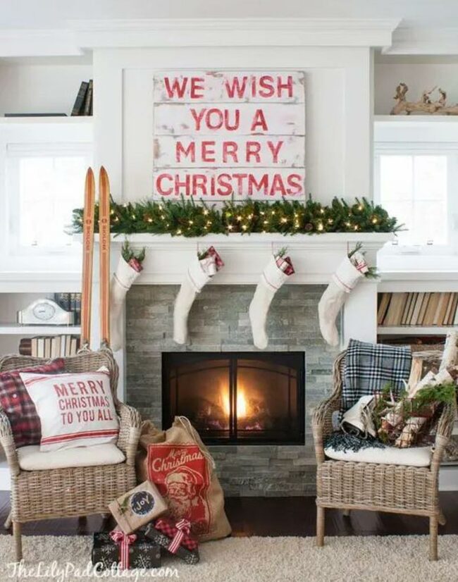 Fireside holiday decor brings warmth and charm to this cozy space.