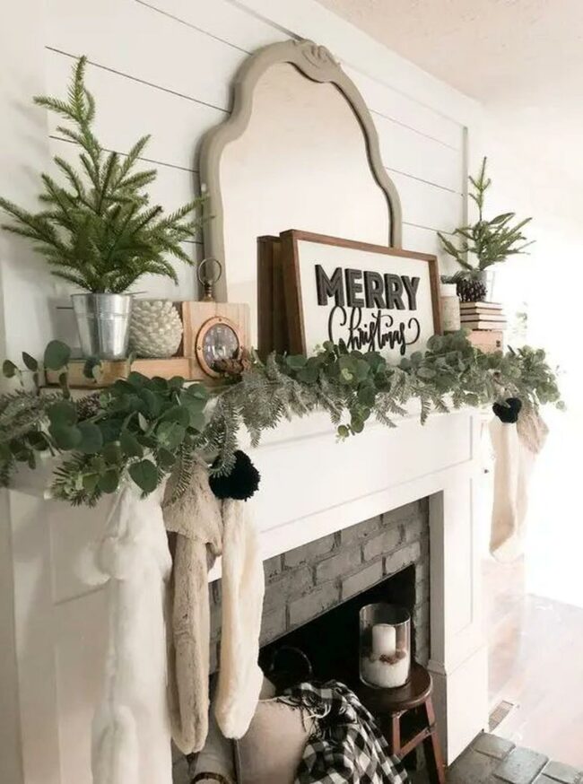 Green leafy garlands drape elegently across the pristine white fireplace mantel, instantly drawing eyes.