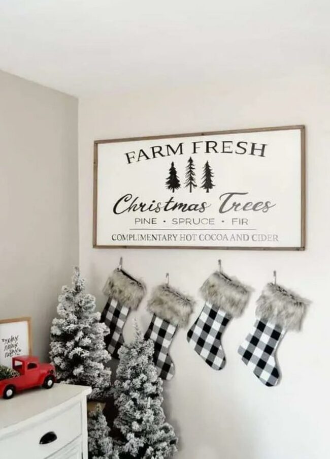 A rustic "Farm Fresh Christmas Trees" sign adds vintage character above the stockings.