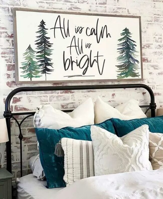 Mounted above the bed, a charming sign with green pine trees and the words "All is calm All is bright" adds a heartwarming personal touch.