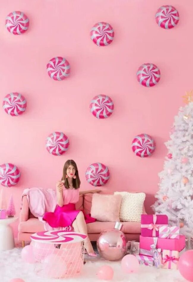 Stepping into this candy-inspired haven, pink walls and giant peppermint decorations create a sweet wonderland that instantly lifts your mood.