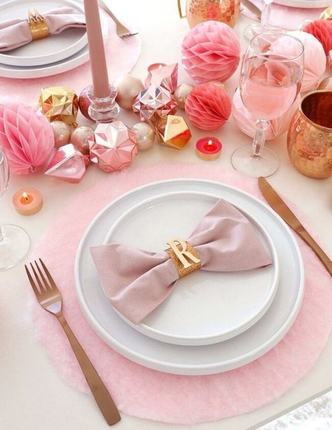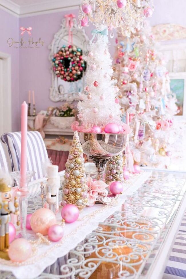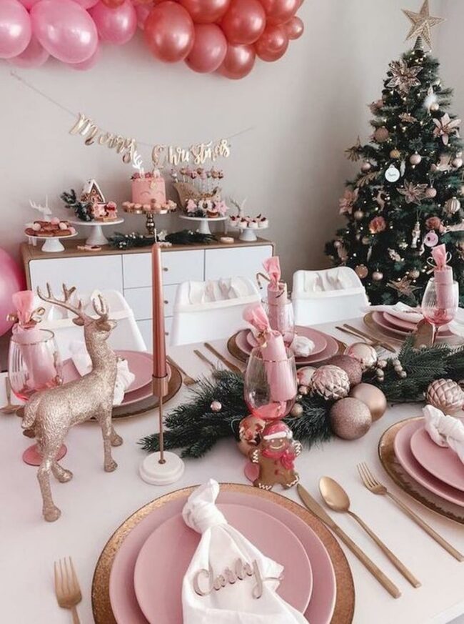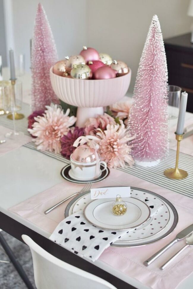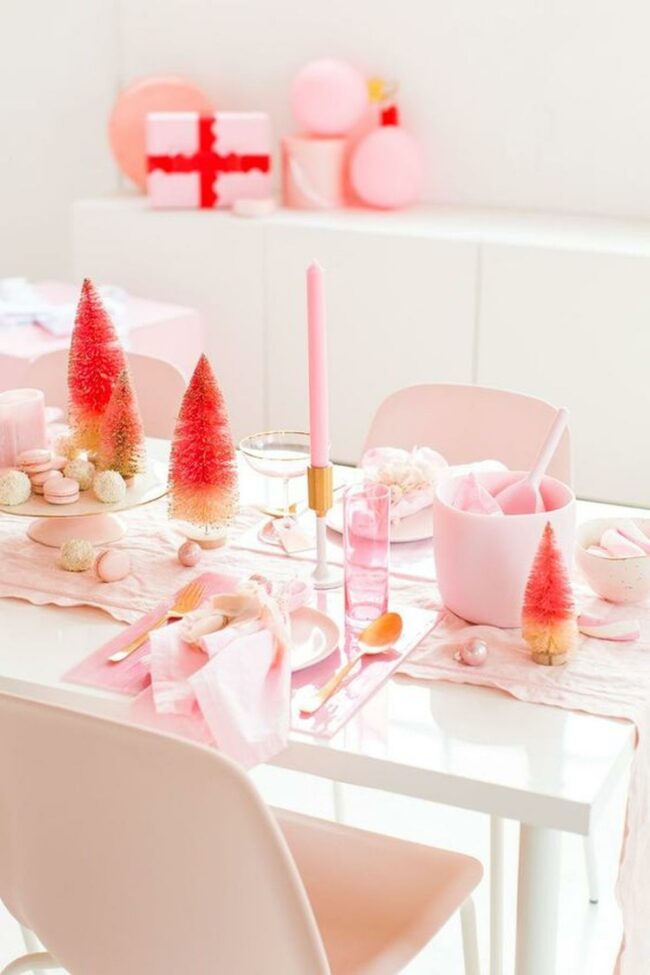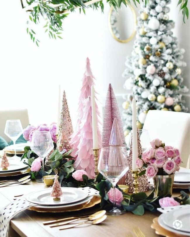 Pink trees and glittery decorations dance across the table, adding unexpected playfulness to the traditional holiday setting.