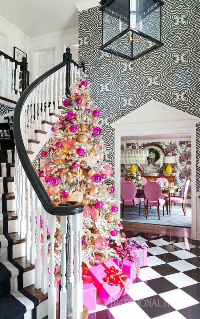Black-and-white checkered flooring immediately grabs attention in this festive space where a tall Christmas tree adorned with pink and gold ornaments stands proudly near the staircase.