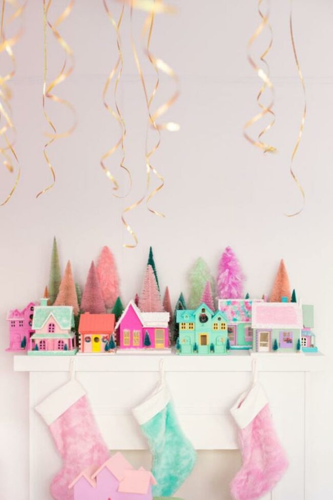 Small rainbow-colored houses create a charming display on the white mantel, drawing your eyes to their pink, turquoise, and green facades.