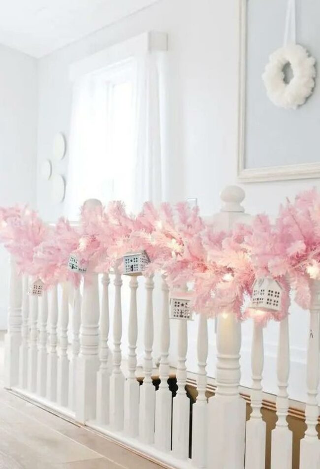 Green garlands wind gracefully along the stair railings, offering a refreshing contrast to the predominantly pink color scheme.