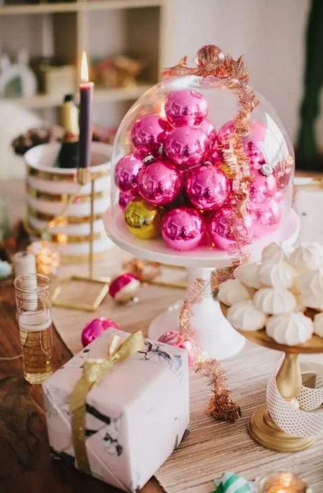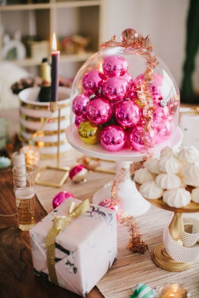 Holiday magic comes alive with eye-catching pink and gold ornaments displayed under a glass dome that reflects light throughout the room.