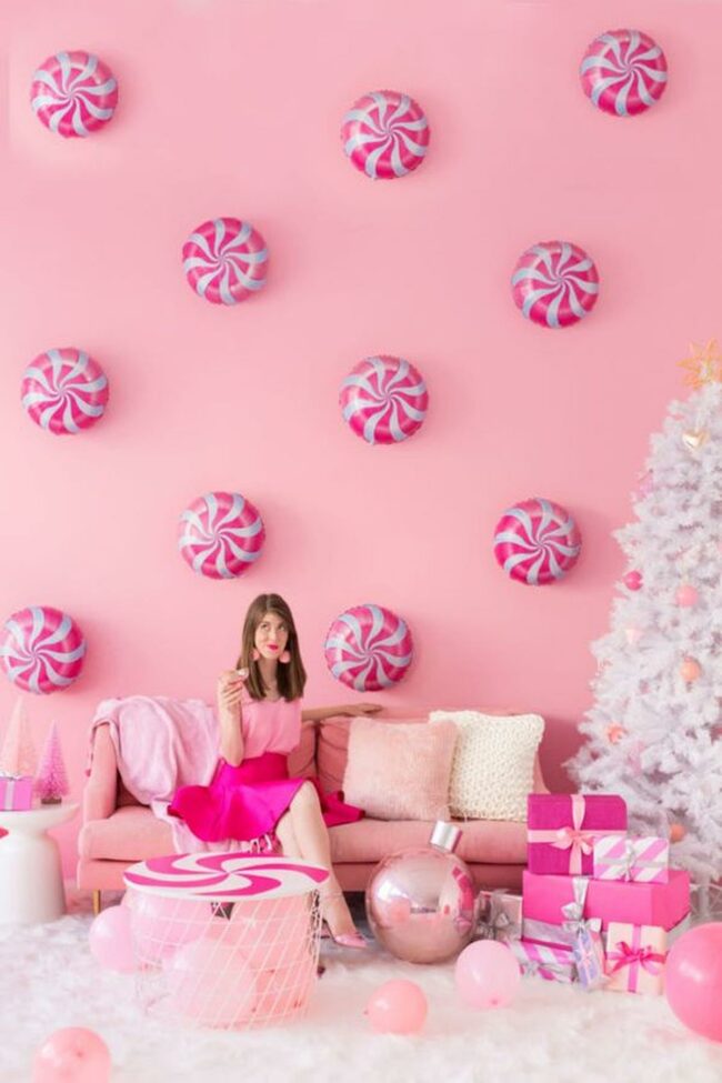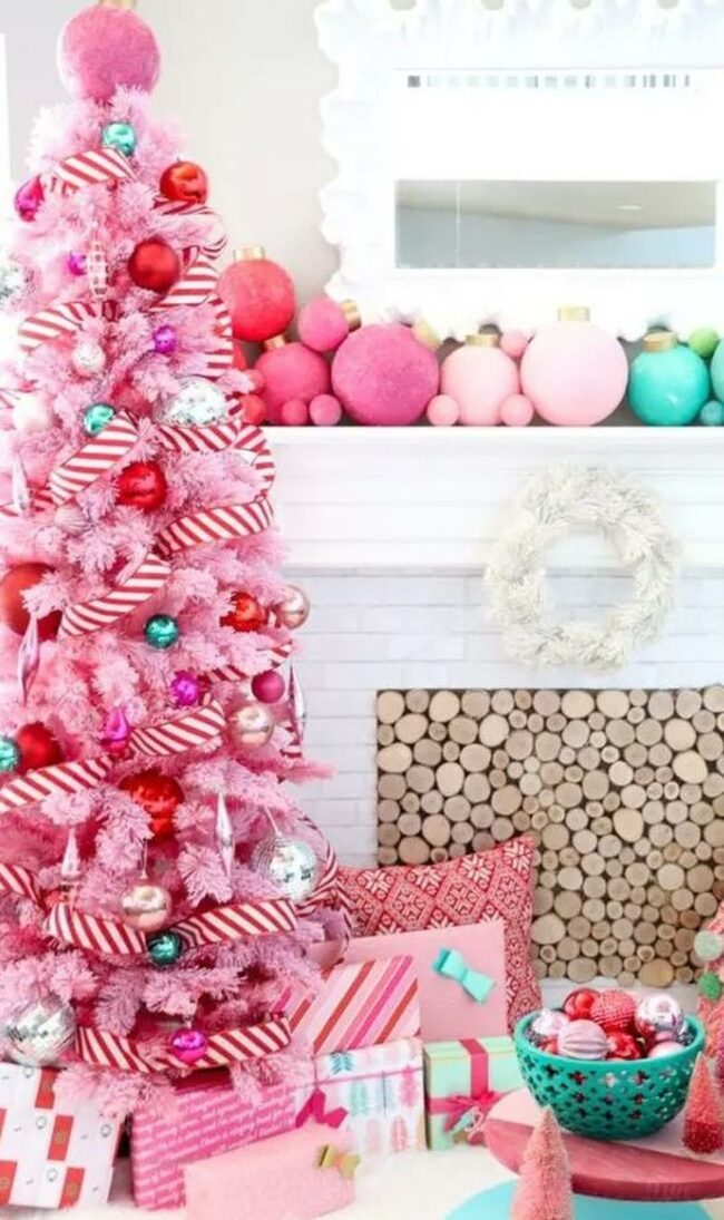 Pink Christmas decorations create a joyful atmosphere throughout this cheerful room, with a standout pink tree adorned in red and white striped ribbons and playful ornaments.