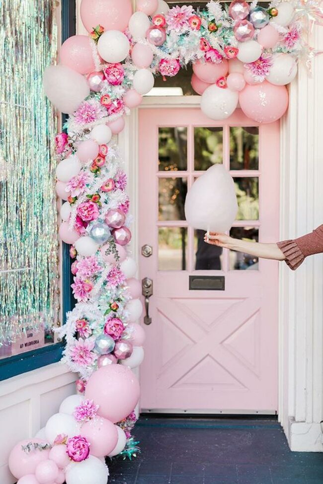 Stepping through this cheerful pink door feels like entering a mini celebration with its festive balloon arch blending white and pink spheres alongside fresh flowers.
