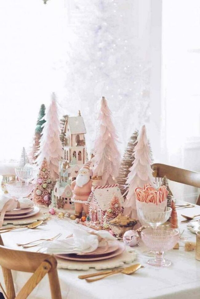 Pink and white holiday decorations bring a gentle charm to this dining table, while tall feathery trees in pastel colors create a sweet winter scene among tiny houses and a Santa figure.