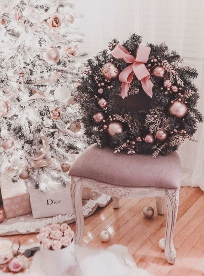 The matching green wreath with its shiny baubles and oversized pink bow sits perfectly on an elegant chair that features detailed carved legs and light fabric.