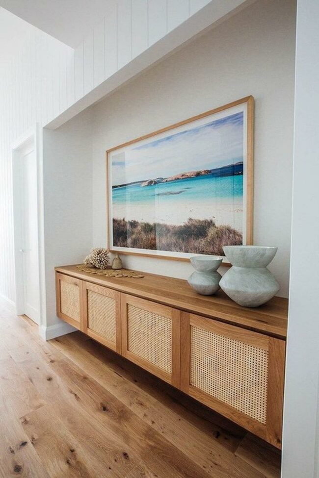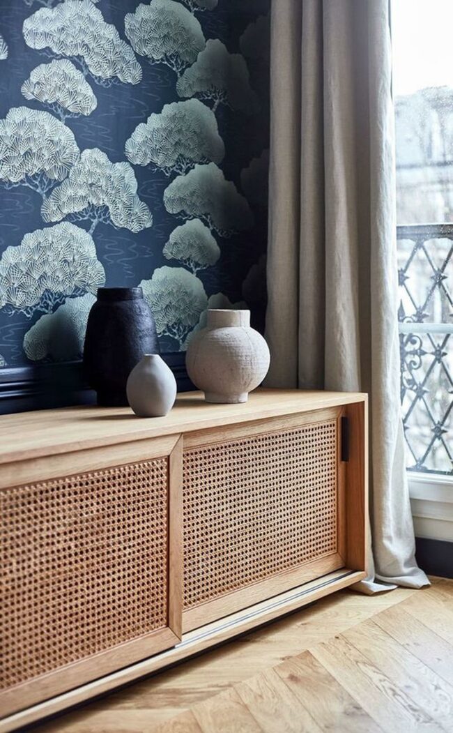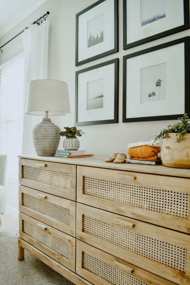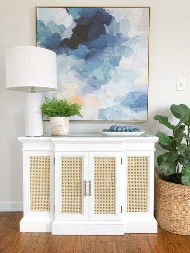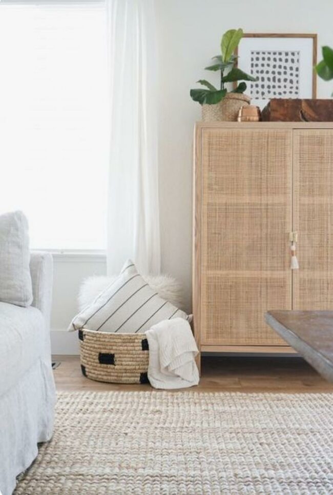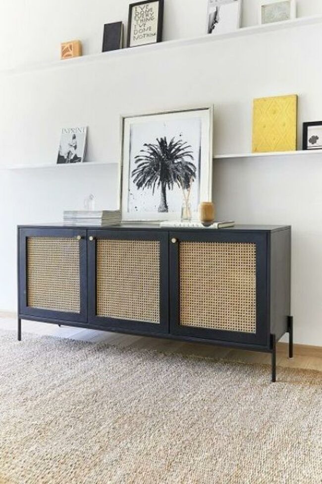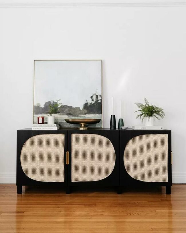 Rattan details on the wooden cabinet introduce warmth and organic elements to the room.