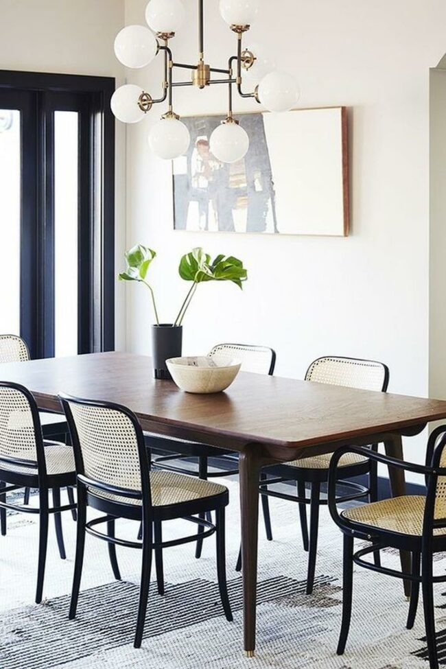 Black-framed chairs featuring woven seats bring natural textures around the long table.