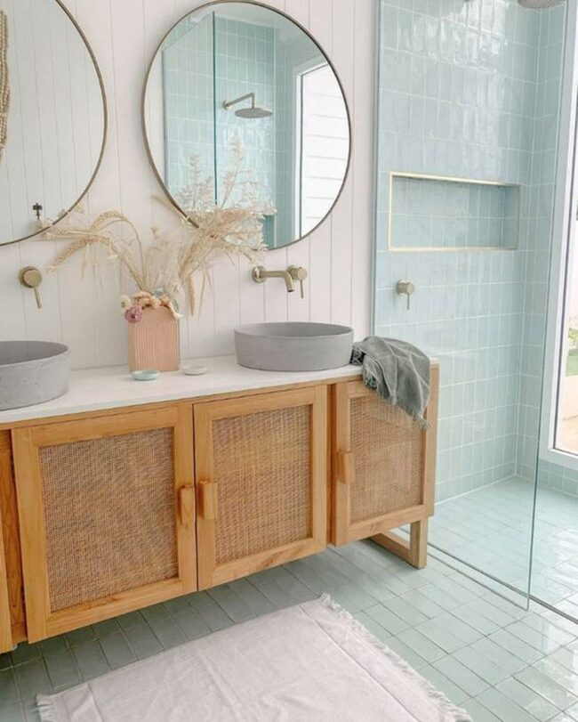 Gray stone sinks add a modern edge to the room's soft aesthetic, complementing the wooden cabinet with woven panels underneath two round mirrors.