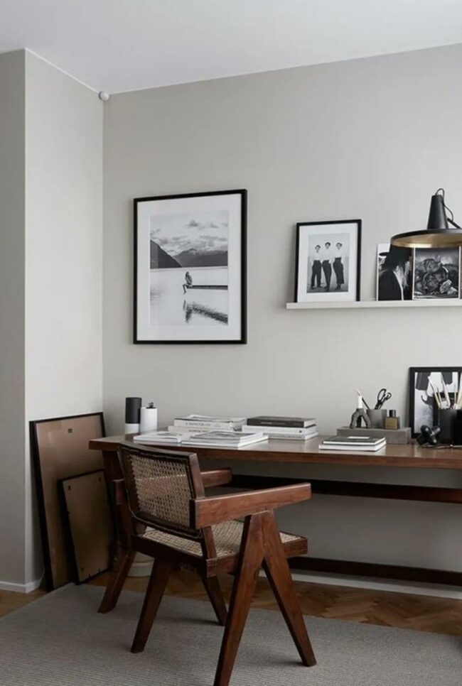Workspace design embraces natural elegance through a wooden desk and woven chair that anchor the room's serene aesthetic.