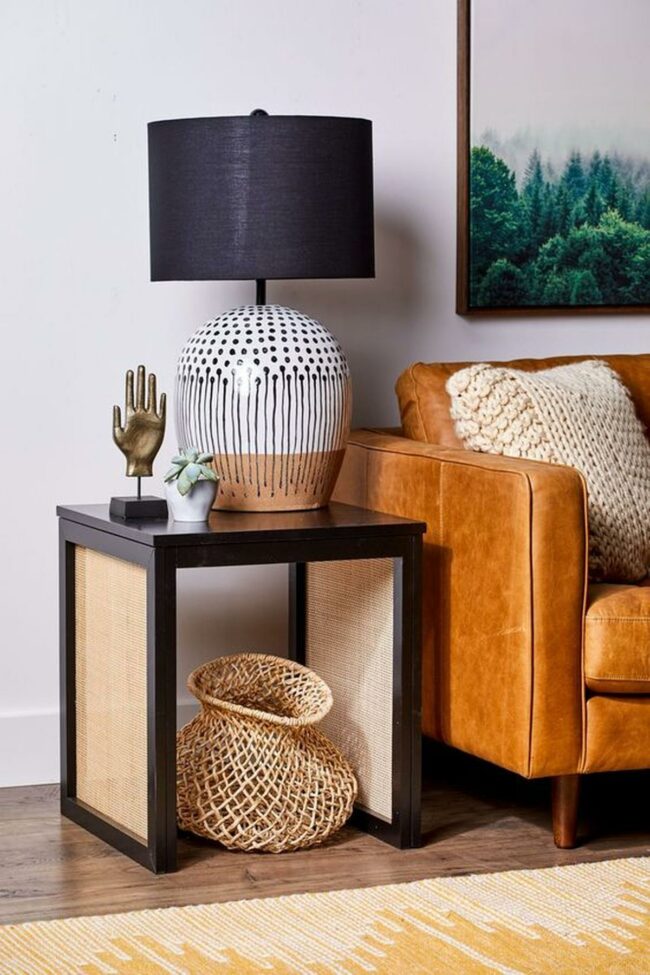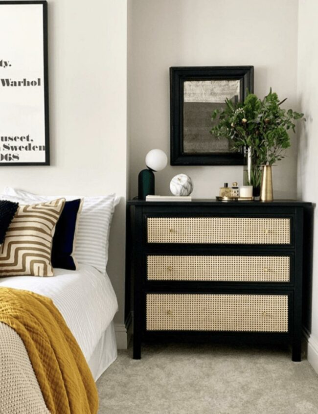 Black dresser with woven drawer fronts becomes the focal point, introducing striking texture and modern style.
