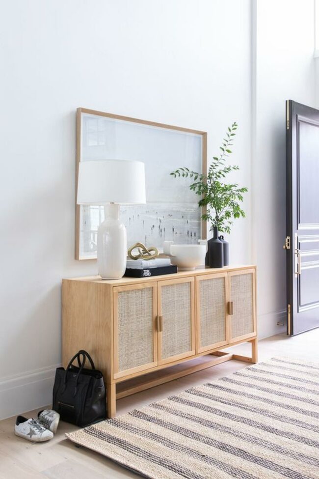 Entryway designs showcase natural warmth through light wood furniture with woven doors that instantly welcome you.