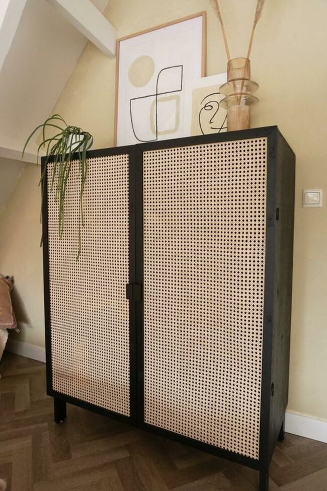 A wooden cabinet with a woven front stands tall, introducing natural texture and visual interest.