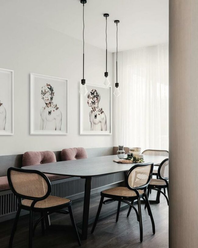 Woven chairs with black frames introduce intriguing textural contrast to the space.