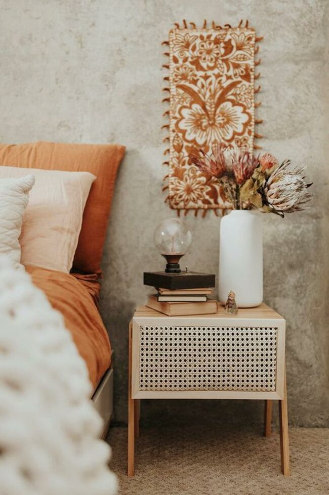 Natural textures emerge through a wooden nightstand with a woven front, adding depth and character to the space.