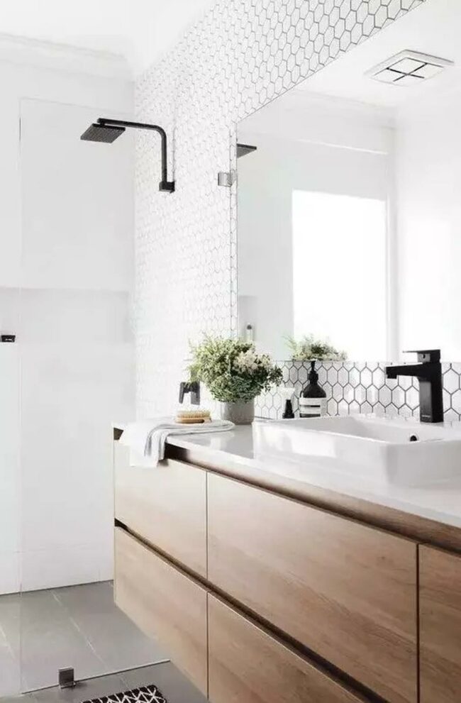White hexagon tiles are the showstopping backdrop in this refreshing bathroom design.