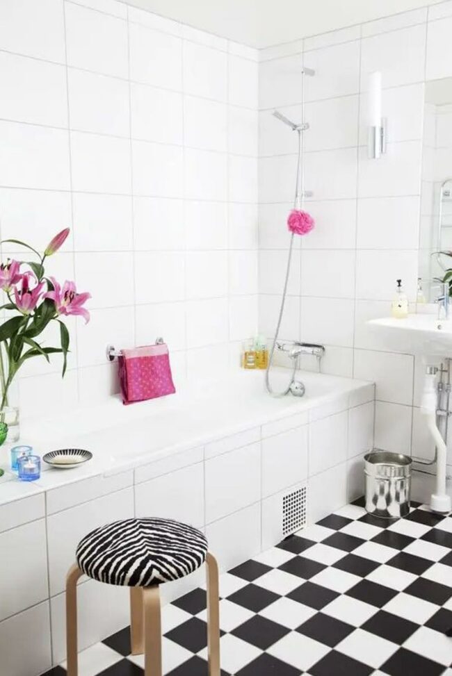 Black and white checkered floors add a playful geometric pattern that energizes the space.
