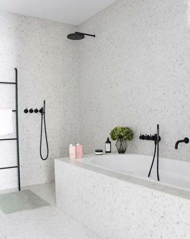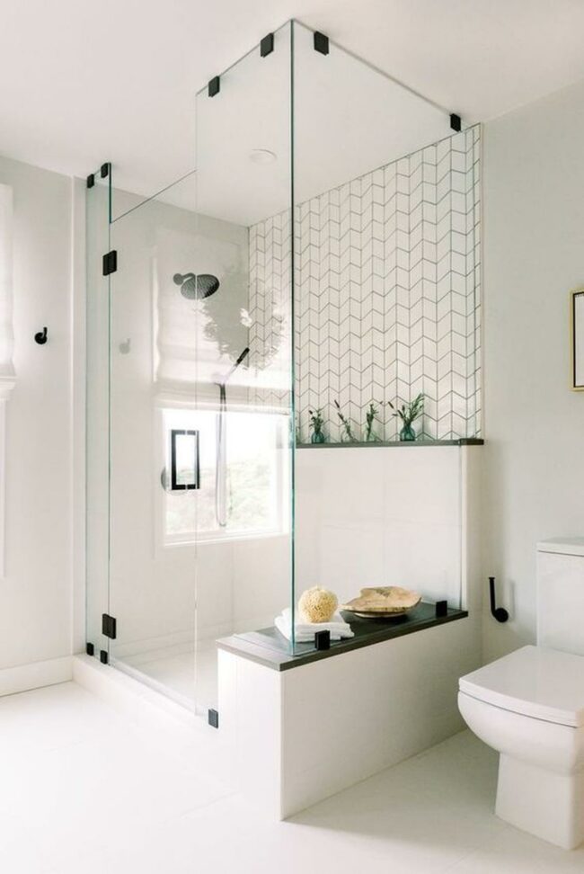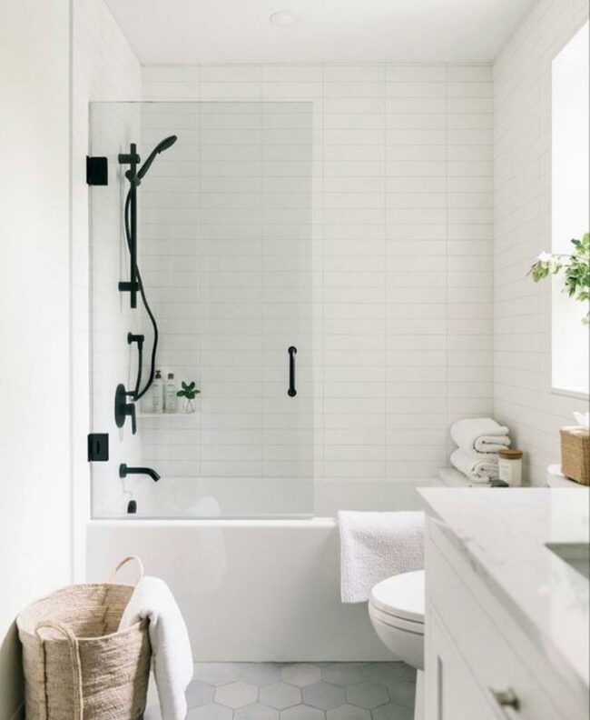 Dark-framed glass shower panels add dramatic contrast against the bright surfaces.