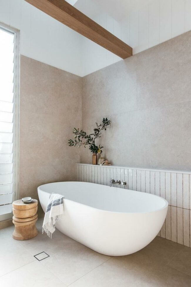 A simple stool near the bathtub holds folded towels and soft candles, providing practical elegance.