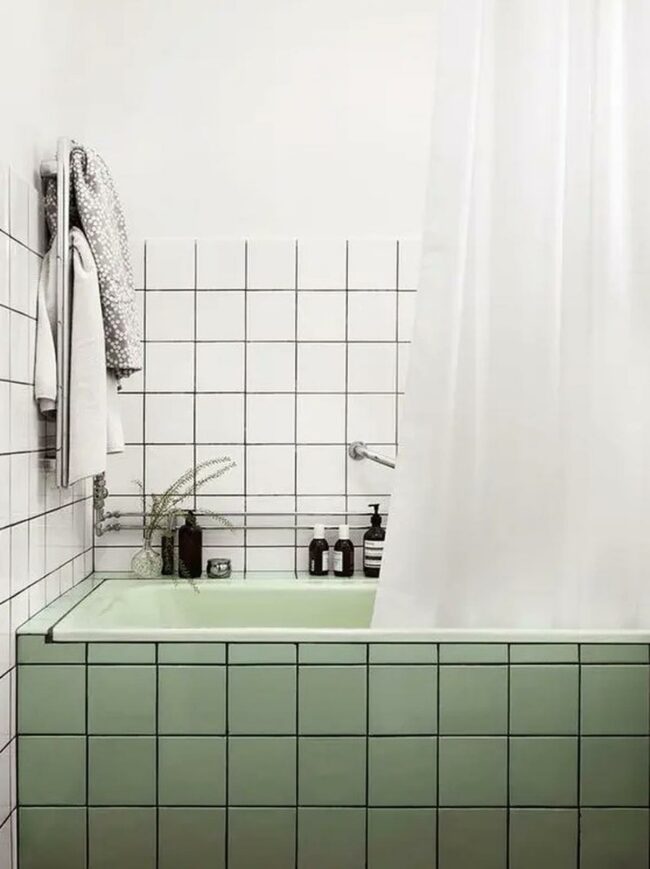 Green bathroom walls and white tile shower radiate a refreshing feel.