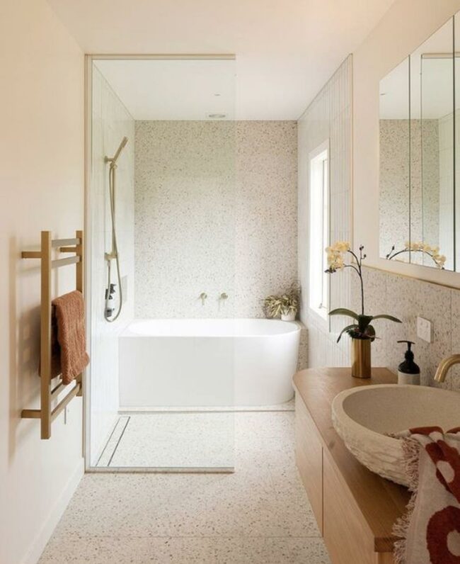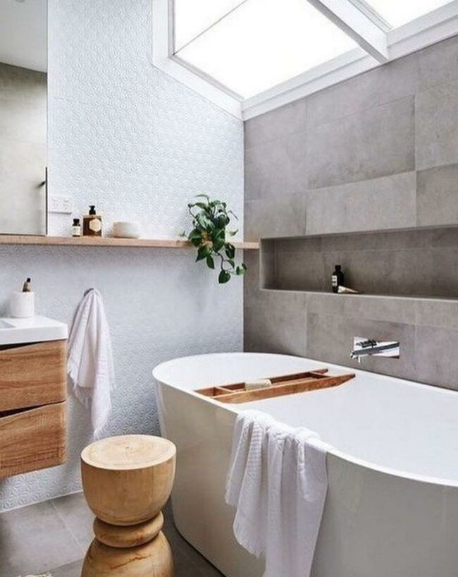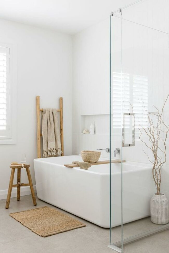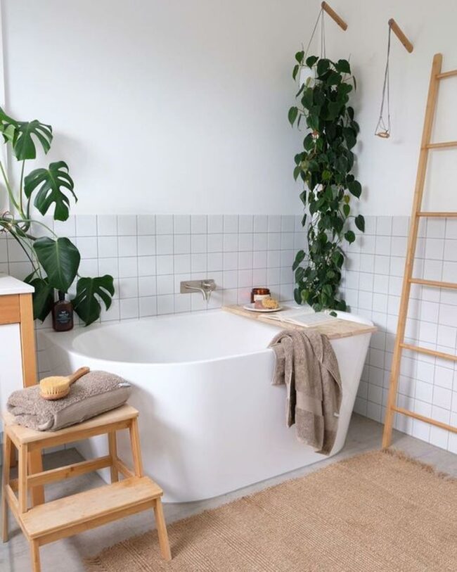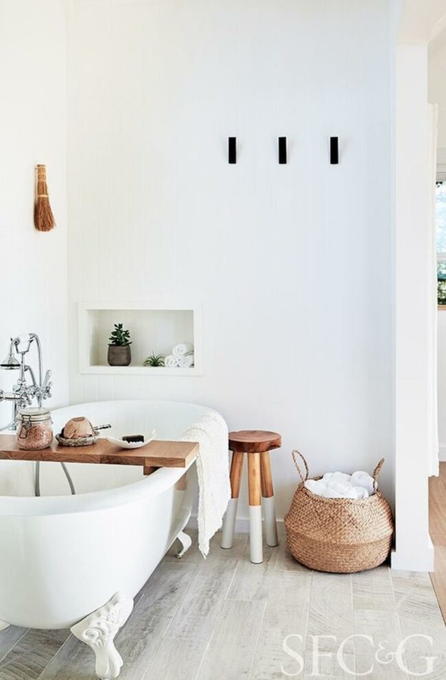 A small wooden stool holds a delicate dish, adding functional charm near the tub.
