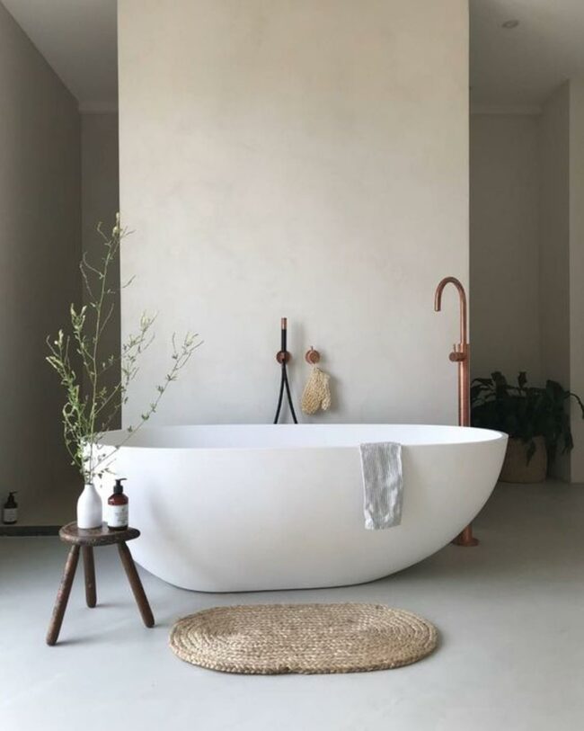 Woven baskets and soft folded towels draped near the tub introduce natural warmth and texture.